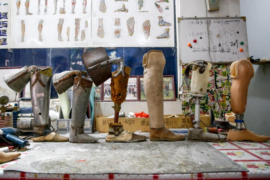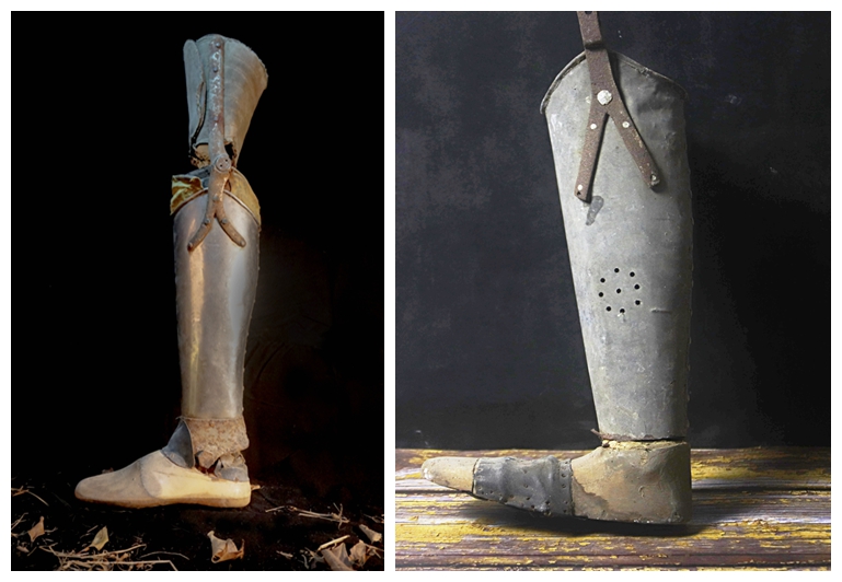 • 2000年以后,针对使用者取模定制,材质是树脂制成的假肢逐渐普及(右一)。减轻了重量的同时,最重要是完全适应残端形态,不会磨损,避免溃疡发生。