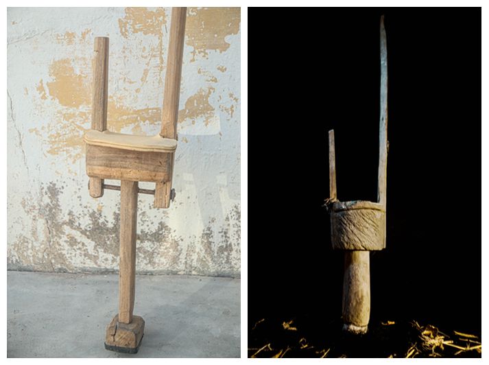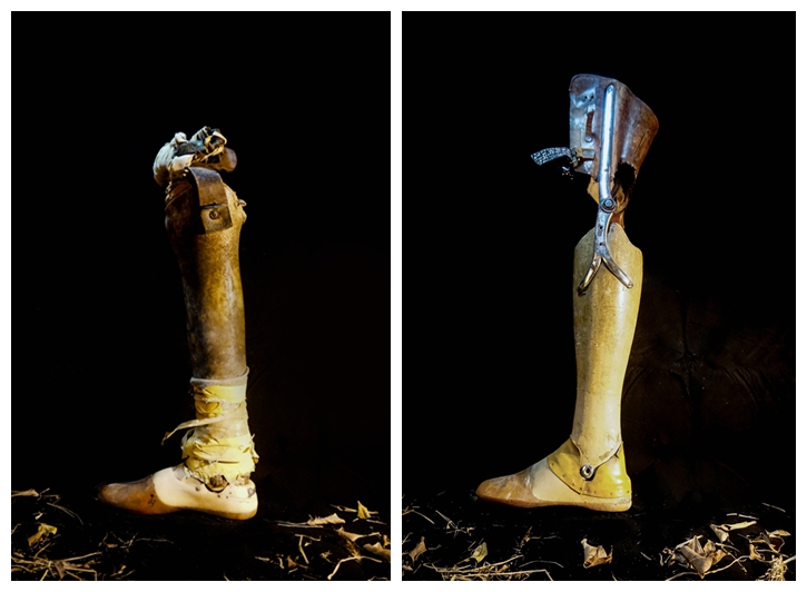 • 60-90年代的各式假肢,由病友自制。最初仅为一根木柱子,残肢放在上端帮助移动,其中一根的支撑台上还垫了海绵垫,增加舒适性。